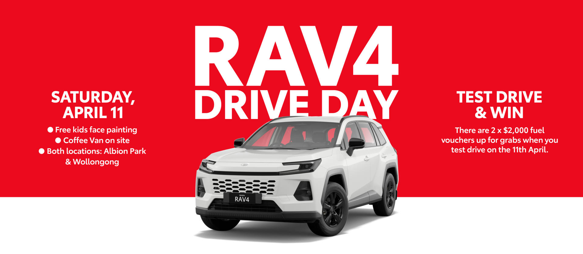 Join us this Saturday April 11 from 9am - 4:30pm, for a family-friendly drive day at Albion Park or Wollongong featuring free coffee and kids face painting.